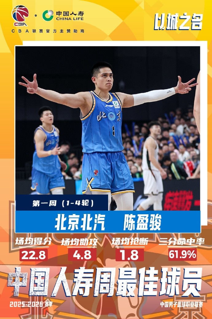 直播吧12月22日讯 CBA官方宣布,北京男篮球员陈盈骏当选2025-2026赛季CBA联赛常规赛第一周周最佳球员。