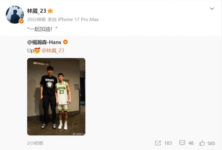 赛后,杨瀚森在个人微博上晒出了两人的合影,并在旁边写道:“Up。”