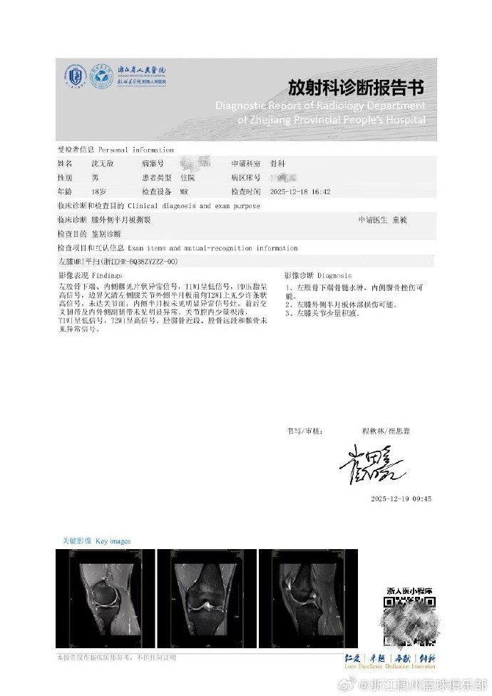 伤情通报|我俱乐部球员沈无敌因左膝外侧半月板撕裂,在俱乐部的安排下于12月19日在浙江省人民医院顺利完成手术,并于今日出院。根据省人民医院专家团队术后评估:沈无敌的康复期预计需要六个月。