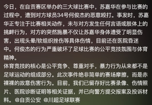 “今日,在自贡赛区举办的三大球比赛中,苏嘉华在参与比赛的过程中,遭到对方球员34号何俊杰的恶意殴打。事发时,苏嘉华正专注于比赛相关动作,未与对方发生任何言语或肢体上的挑衅行为,对方的突然施暴不仅让苏嘉华身体遭受了明显伤害,出现头晕/软组织挫伤等具体伤情,目前还在医院昏迷中。