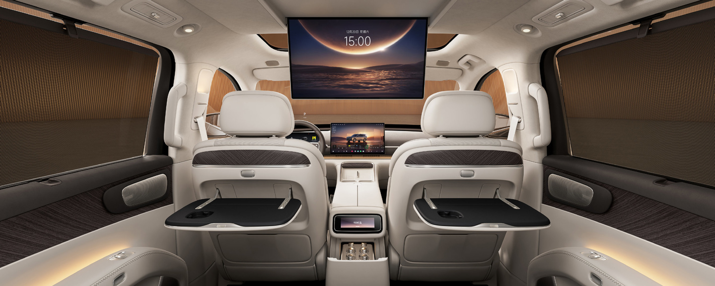 二排“零重力”座椅:支持 120° 零压躺姿、4 向腿托,集成 ABTS 一体式安全带,迎宾模式下形成 195mm 超宽中央通道,方便第三排乘客进出。