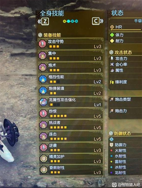 武器选择以属性激化为主攻方向,搭配凶爪与霸魂词条形成核心输出框架。护石推荐采用炮术三级搭配挑战者一级的组合,在保证基础伤害的前提下,怨恨连击与挑战者技能可完美激活。九个一级装饰珠插槽为配装提供了充分的灵活调整空间。