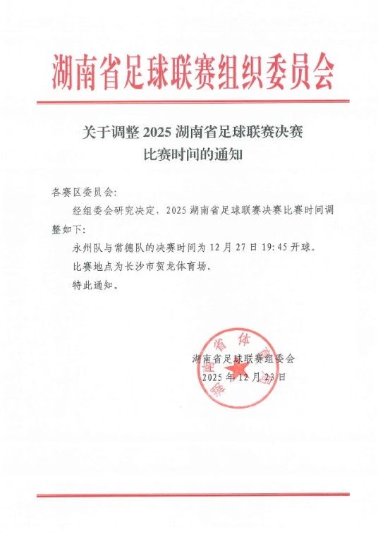 湖南省足球联赛组织委员会发布通知,调整2025湘超决赛比赛时间,永州队与常德队的决赛时间为12月27日19:45开球,比赛地点为长沙市贺龙体育场。