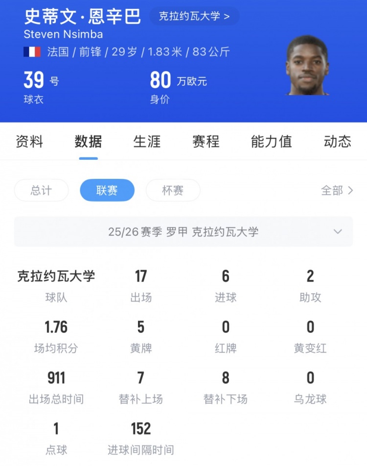 1996年出生的法国中锋恩辛巴今年7月加盟克拉约瓦大学,当时米特里策刚刚离开这支球队加盟浙江FC,恩辛巴和克拉约瓦大学的合同签到了2027年6月30日。本赛季的罗甲已经进行了21轮,克拉约瓦大学积40分排在积分榜第一,恩辛巴和拜亚姆同进6球成为联赛队内最佳射手,恩辛巴各项赛事贡献9球3助攻。
