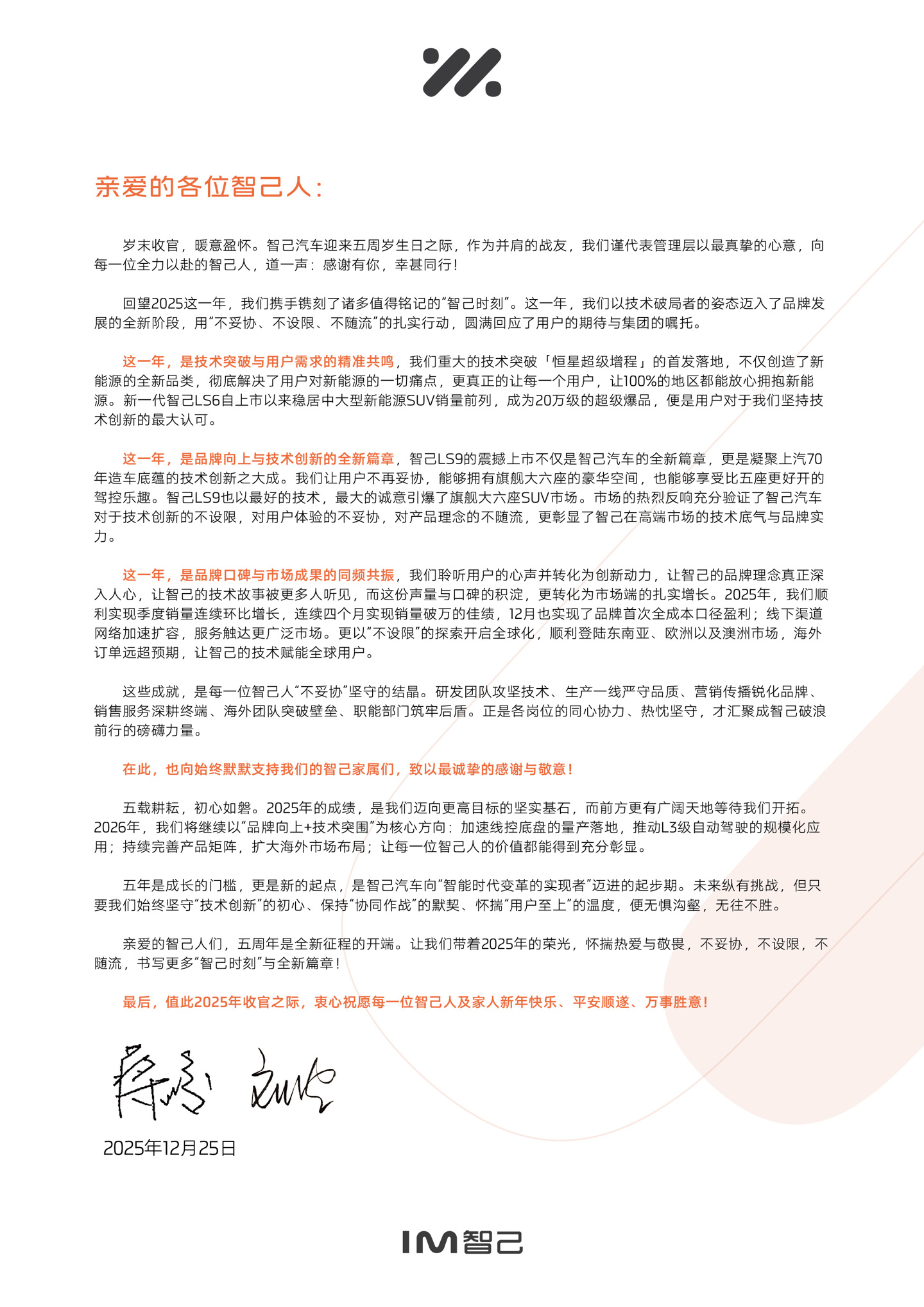12 月 25 日消息,智己汽车今日迎来成立五周年,官方发布了致全体员工的内部信,借此回顾 2025 年的发展成果与 2026 年的规划。