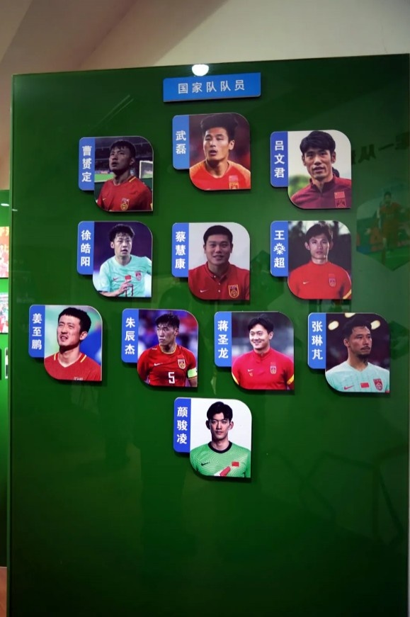 之前基地荣誉室的展板位置只放置了武磊、张琳芃等少数几位球员照片,且以横列式展示。而最新出现在展板上的是11位球员,排列的位置恰好符合一支球队的首发,由此推断这11位球员正是徐根宝培养出的所有“崇明子弟兵”中选出的最佳阵容。