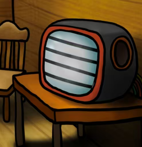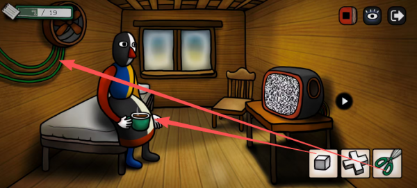 把方糖给它,获得硬币;同时用剪刀剪断背后的绿线,电视会出现线索(多点几次电视切换频道,获得成就“无物象的电视频道”),剪刀用完了还可以再捡起来,还有风扇的叶片,别漏了