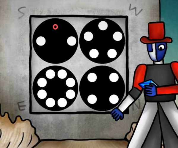 根据屋子外的旗帜线索,开下面这个门,一共有4个哦,其实它们有组合了就加小黑方块,和颜色什么的没关系