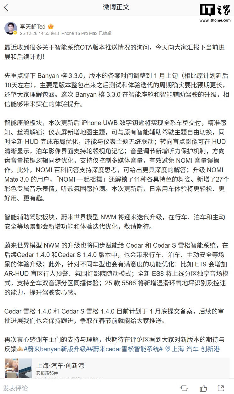 12 月 26 日消息,蔚来汽车产品副总裁 @李天舒Ted 今日在微博发文,公布了有关系统 OTA 版本推送情况及最新进展。