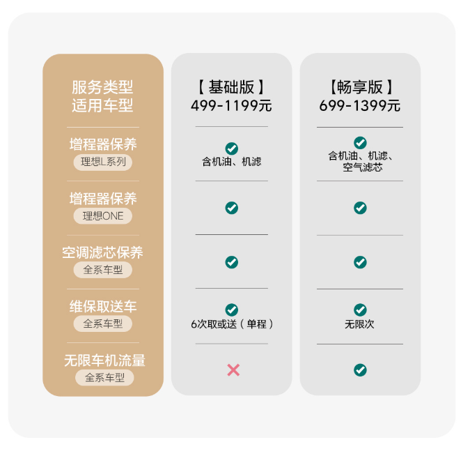 对于为什么推出基础版用车服务包?理想汽车表示,在聆听了数万位车主的真实反馈后发现:保养是刚需,增程器与空调滤芯保养,是每年必须进行的保养项目;取送车服务是臻选权益,每次取送车服务平均为用户节省往返时间约为 90 分钟;流量不必“无限量”,多数车主,随车赠送的每月 20GB 流量可以覆盖日常需求。