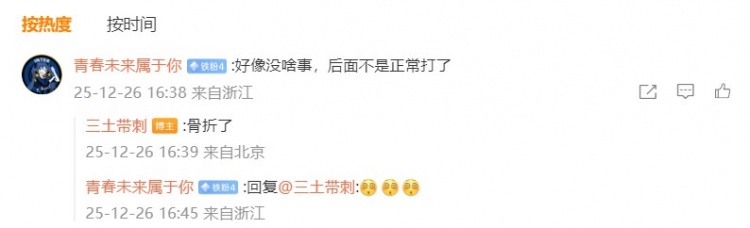 直播吧12月26日讯 据媒体人@三土带刺 报道,孙铭徽遭遇鼻骨骨折。