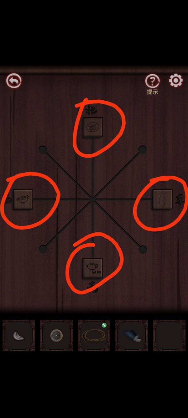 8、观察之前指南针三个地方游戏线索古董方位,剧情对话已经给,再加上画红圈那几个古董方位,把古董像移五角星那样一点一点移动,移动到你用指南针看到位置。