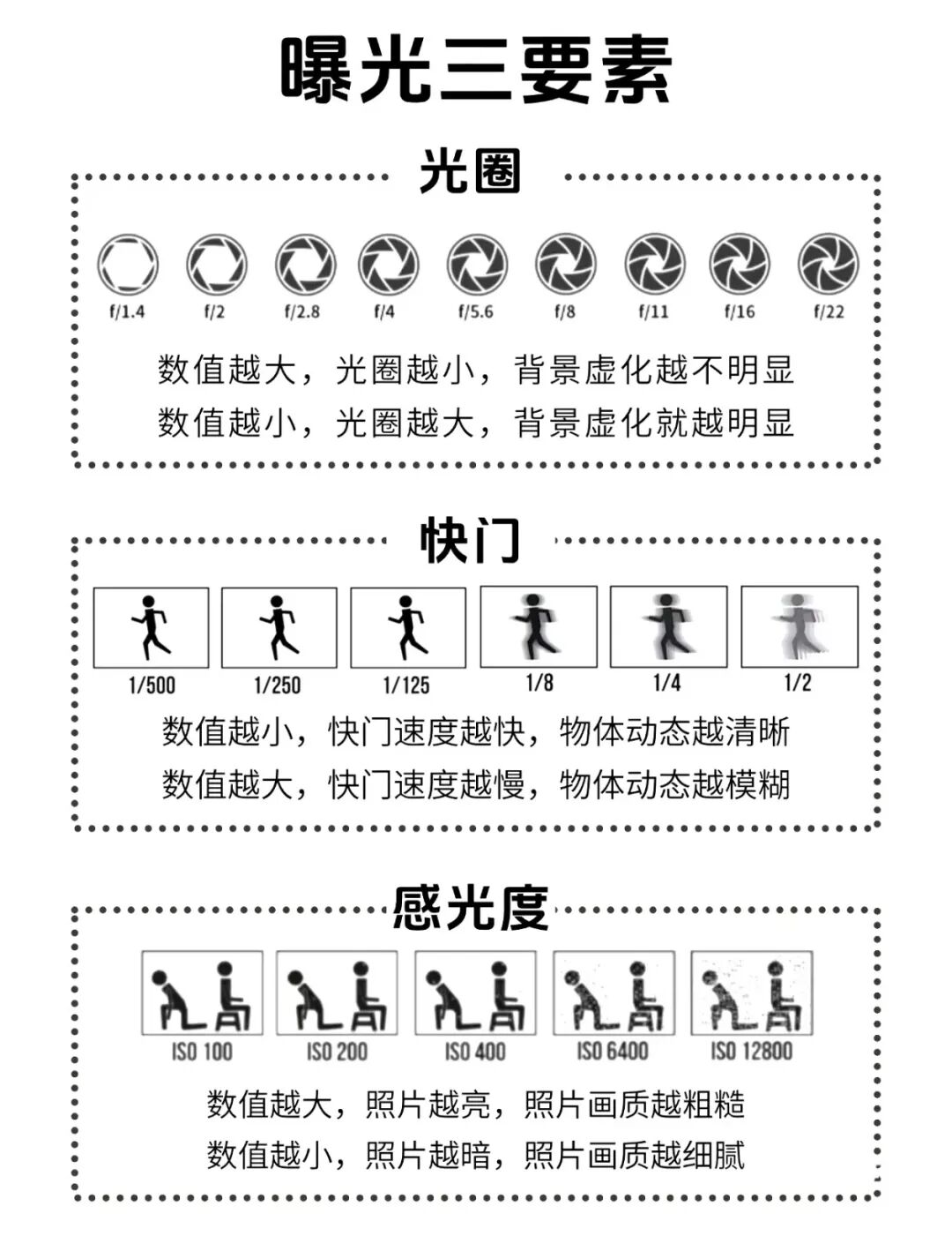 我们可以通过调节光圈、快门、感光度(ISO)来改变照片的亮度,因此这 3 者也被称为曝光三要素。