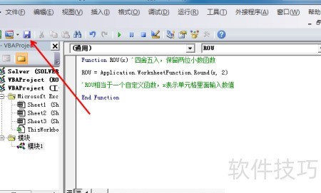 - 在VBA编辑器中输入指定代码后,点击保存按钮即可。