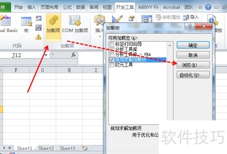 切换到Excel工作表界面,打开开发工具选项卡后,从“加载项”功能区中选择浏览按钮。