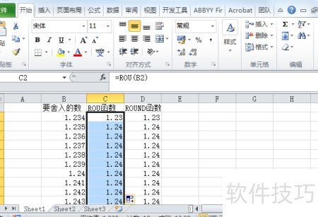 在C元格输入公式=ROU(B,向下填充后,结果显示的结果与应用ROUND函数四舍五入到两位的值相同。