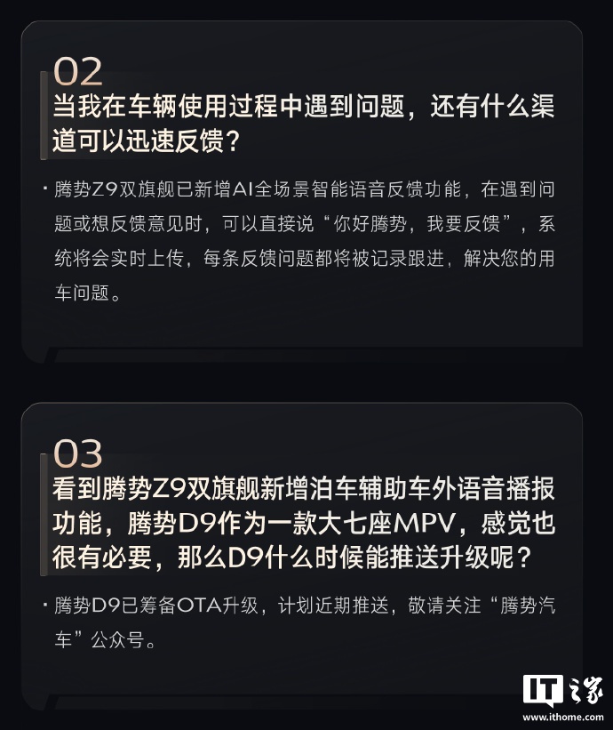 此外注意到,官方还宣布,腾势 Z9 双旗舰已新增 AI 全场景智能语音反馈功能,在遇到问题或想反馈意见时,可以直接说“你好腾势,我要反馈”,系统将会实时上传,每条反馈问题都将被记录跟进,解决车主用车问题。
