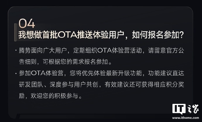 官方提醒,腾势会定期组织 OTA 体验营活动,请留意官方公告细则,可根据需求报名参加。