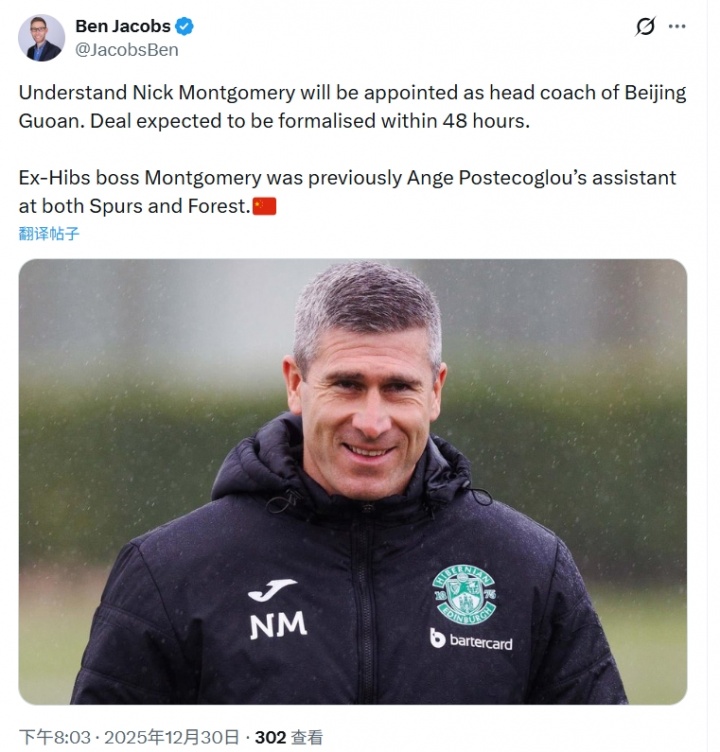直播吧12月30日讯 据记者雅各布斯(Ben Jacobs)报道,尼克·蒙哥马利将出任北京国安主帅,预计正式协议在48小时内签署。