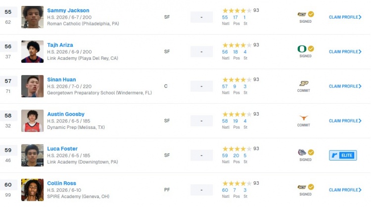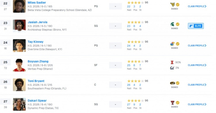 直播吧2月3日讯 在选秀网站Rivals的2026届全美高中生最新排名中,四星高中生张博源排名全美第25位,他也成为该榜单排名最高的中国球员。