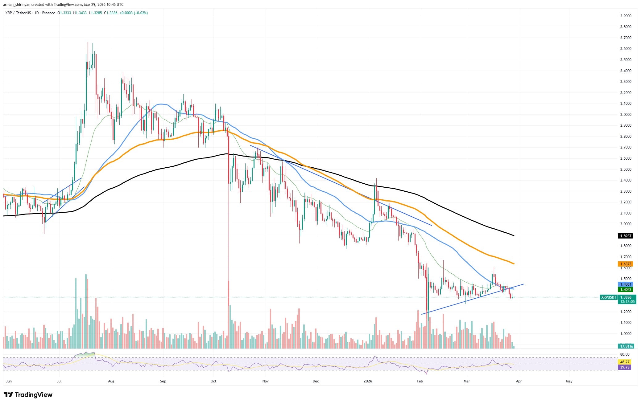 XRP价格仍处明确下降通道,移动平均线持续施压形成更低高点。该资产近期曾尝试突破短期上升支撑线,却因动能不足回落至1.30-1.35美元区间。该区域现构成关键支撑位,若失守或将下探至与2026年前低对应的1.20美元区域。