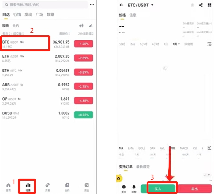 将USDT从资金账户划转至现货账户后,在BTC/USDT交易对中可设置限价单或市价单完成买卖。实时行情页面提供深度买卖盘数据供参考。