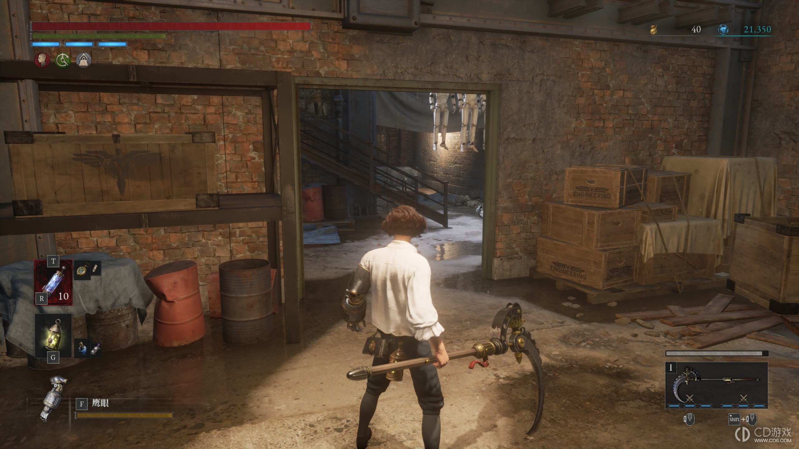 在维尼尼工厂中推进,一定会来到下图场景(有两个重要NPC),沿图中右侧上楼梯后直行。