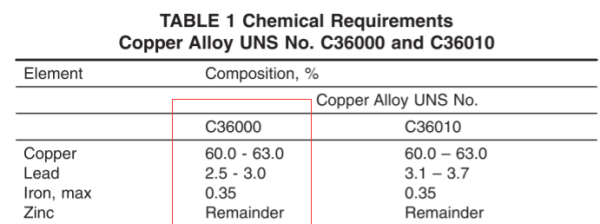 C36000属于美标铅黄铜,执行标准:ASTM B16/B16M-2023