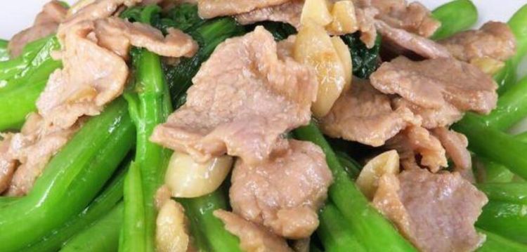 食材:猪肉,广东菜心,大蒜,花生油,食盐,蚝油,生粉。