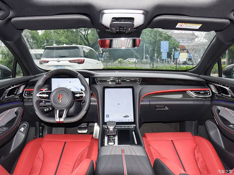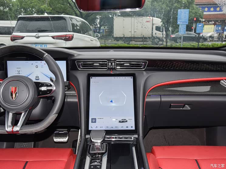 内饰方面并没有造型上的变化,中控台整体布局基本延续自新红旗H5,主要体现在竖向比例的大尺寸中控屏和空调出风口等细节。同时,红旗H6也通过三辐式平底造型方向盘、打孔皮/翻毛皮和碳纤维包裹方向盘、换挡拨片和前排一体式造型座椅等配置,来展现运动化风格。新款车型提升主要体现在配置方面,比如车机系统升级到3.0Plus,从致美版开始就配备全液晶仪表和全景影像功能。