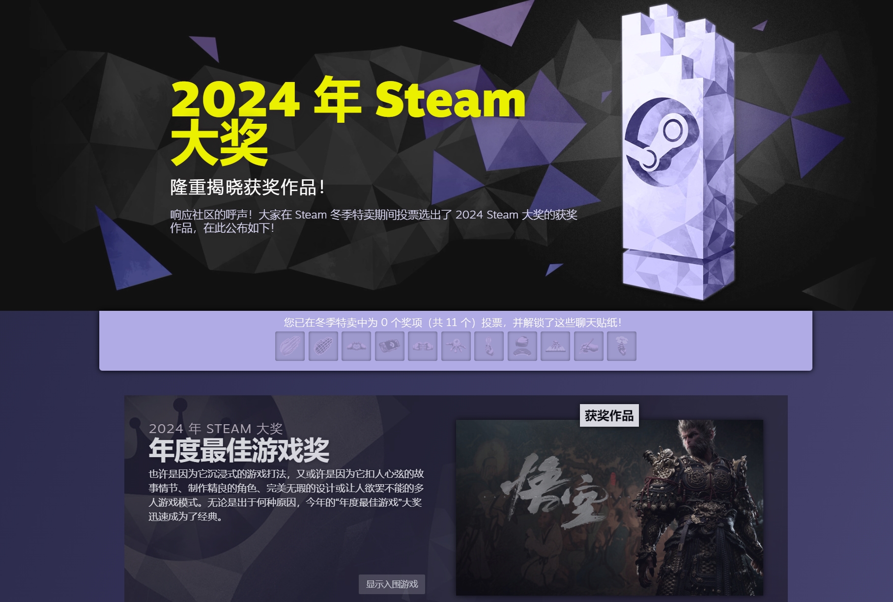 1月1日讯Steam平台的2024年年度奖项正式出炉,黑神话:悟空夺得年度最佳游戏,同时拿下杰出剧情游戏和纵使手残仍大爱奖。Steam年度奖项为玩家投票提名,并在提名作品中投票选出。