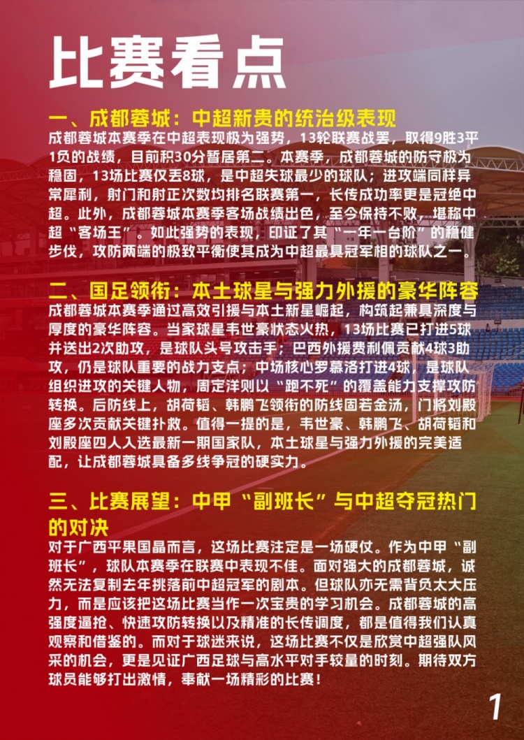 2025中国足协杯第三轮,我们将在平果国晶体育场迎战中超劲旅成都蓉城。本期《赛刊》电子版现正式发布,而纸质版也将在比赛日当天限时限量免费发放,已购票球迷于5月21日12:00-20:00前往平果国晶体育场南广场售票点即可免费领取,限量100份,数量有限,先到先得!