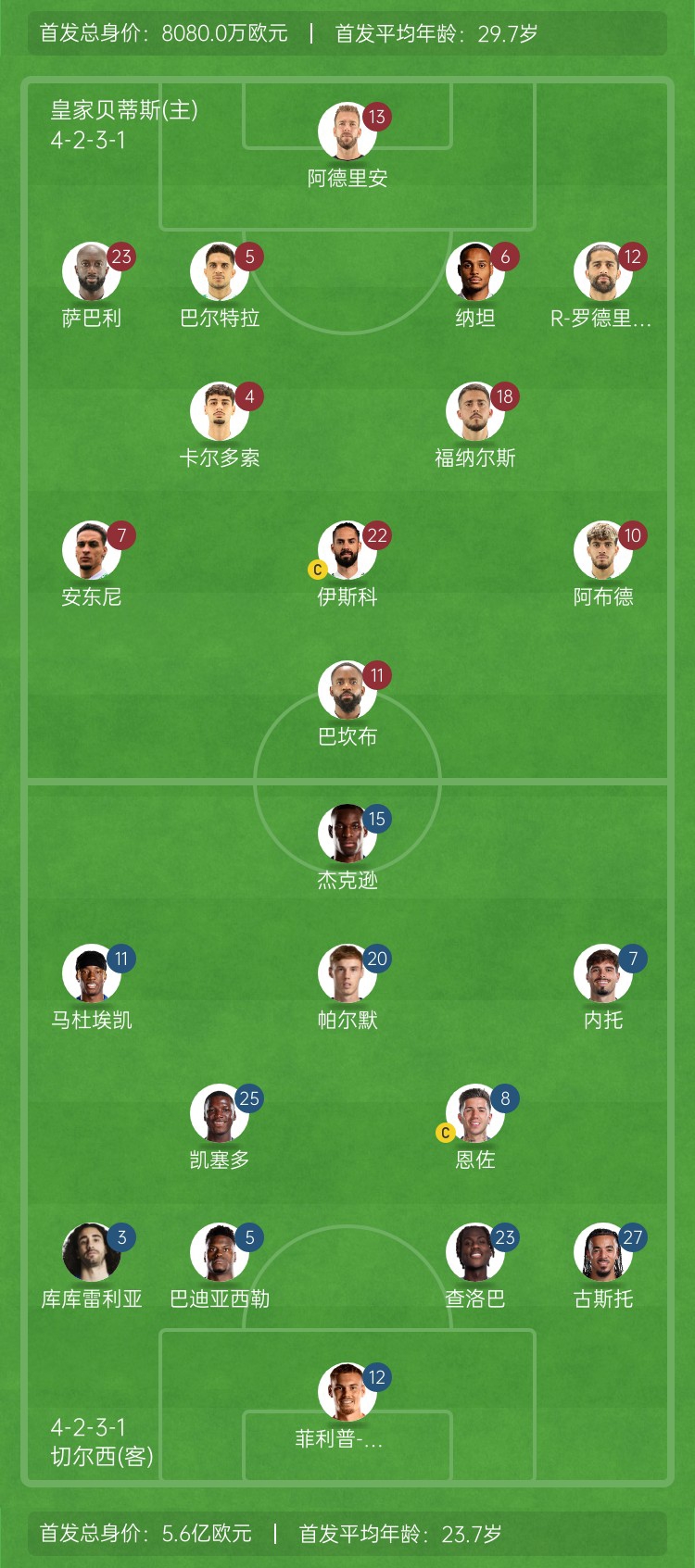 ⚔️欧协联决赛首发身价对比:切尔西5.6亿欧 贝蒂斯8080万欧