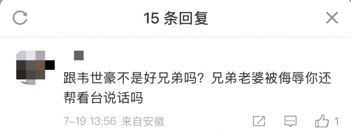 今天有一名球迷在巴顿的微博下评论道:“跟韦世豪不是好兄弟吗?兄弟老婆被侮辱你还帮看台说话吗?”