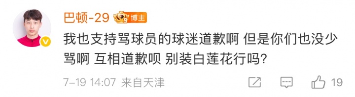 巴顿随后回应这名球迷:“我也支持骂球员的球迷道歉啊 但是你们也没少骂啊 互相道歉呗 别装白莲花行吗?”