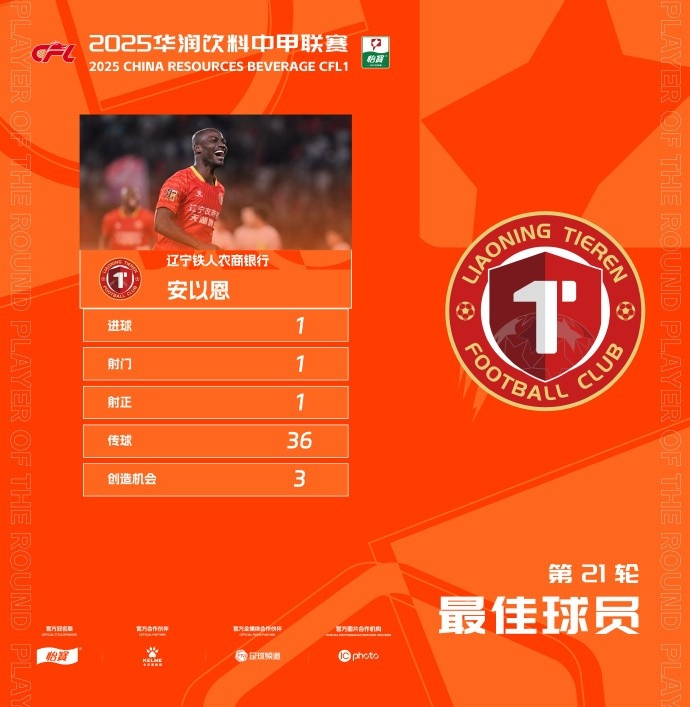 8月19日讯 中甲第21轮最佳球员评选结果出炉,辽宁铁人球员安以恩当选。