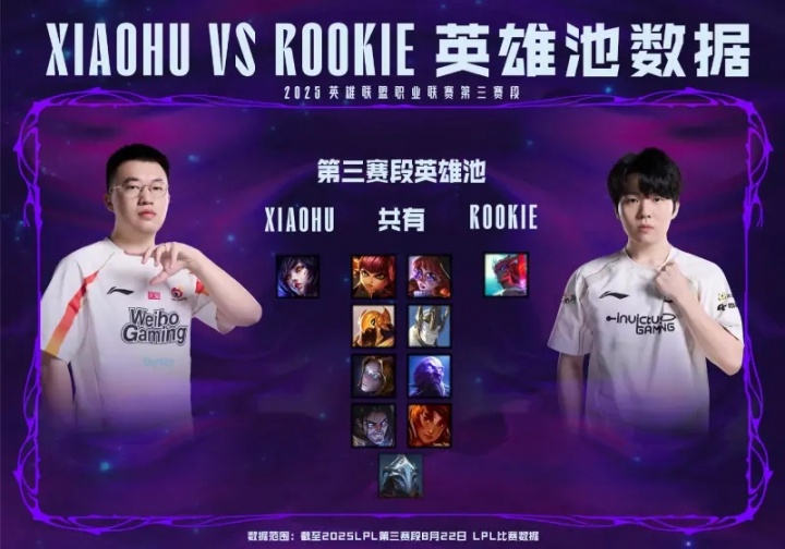 8月23日讯 2025LPL第三赛段常规赛组内赛WBG对战IG - 数据前瞻:Xiaohu和Rookie的第三赛段英雄池中,重合的英雄有9个。