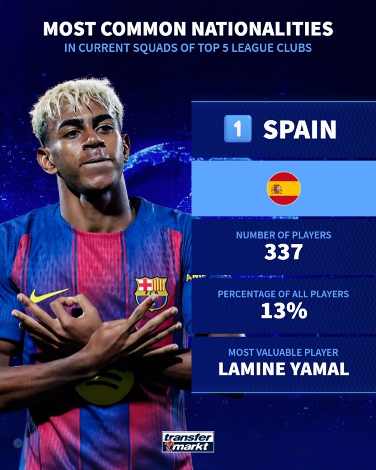 9月16日讯 德国转会市场统计了五大联赛各国球员的数量,并列出榜单,西班牙337人居首。