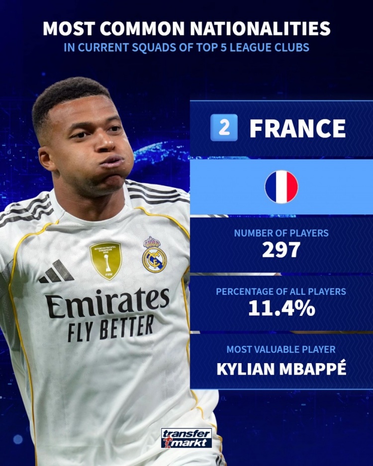 五大联赛各国球员数量排名: