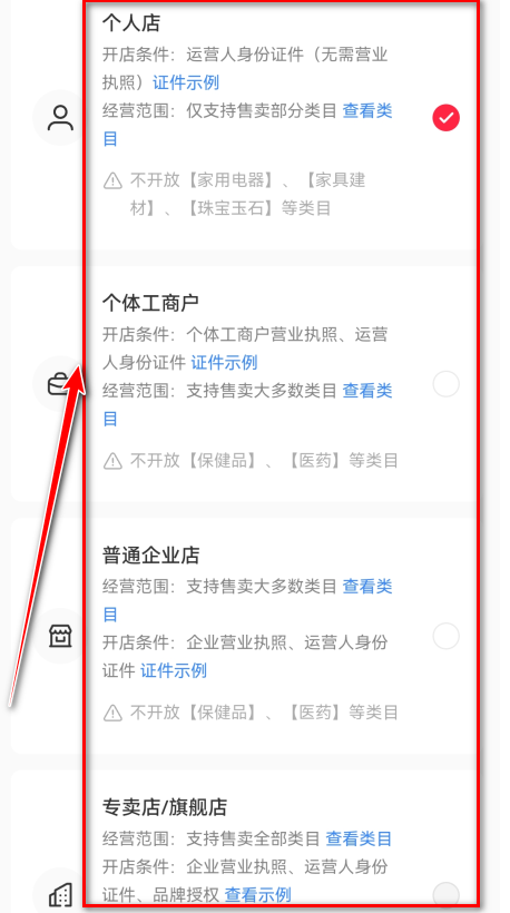 10.上传自己的身份证,勾选免于市场主题登记证明,这个是可以多选的,然后点击下一步店铺信息。