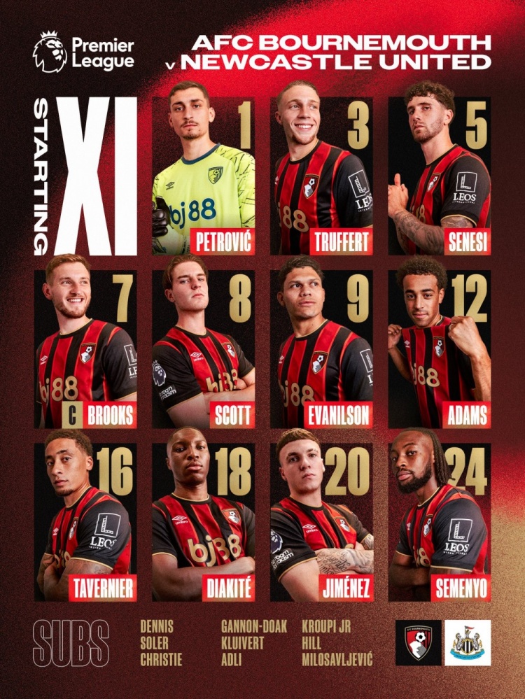 9月21日讯 北京时间今天21点,英超第5轮比赛,伯恩茅斯主场对阵纽卡,两队公布了此役的首发阵容。