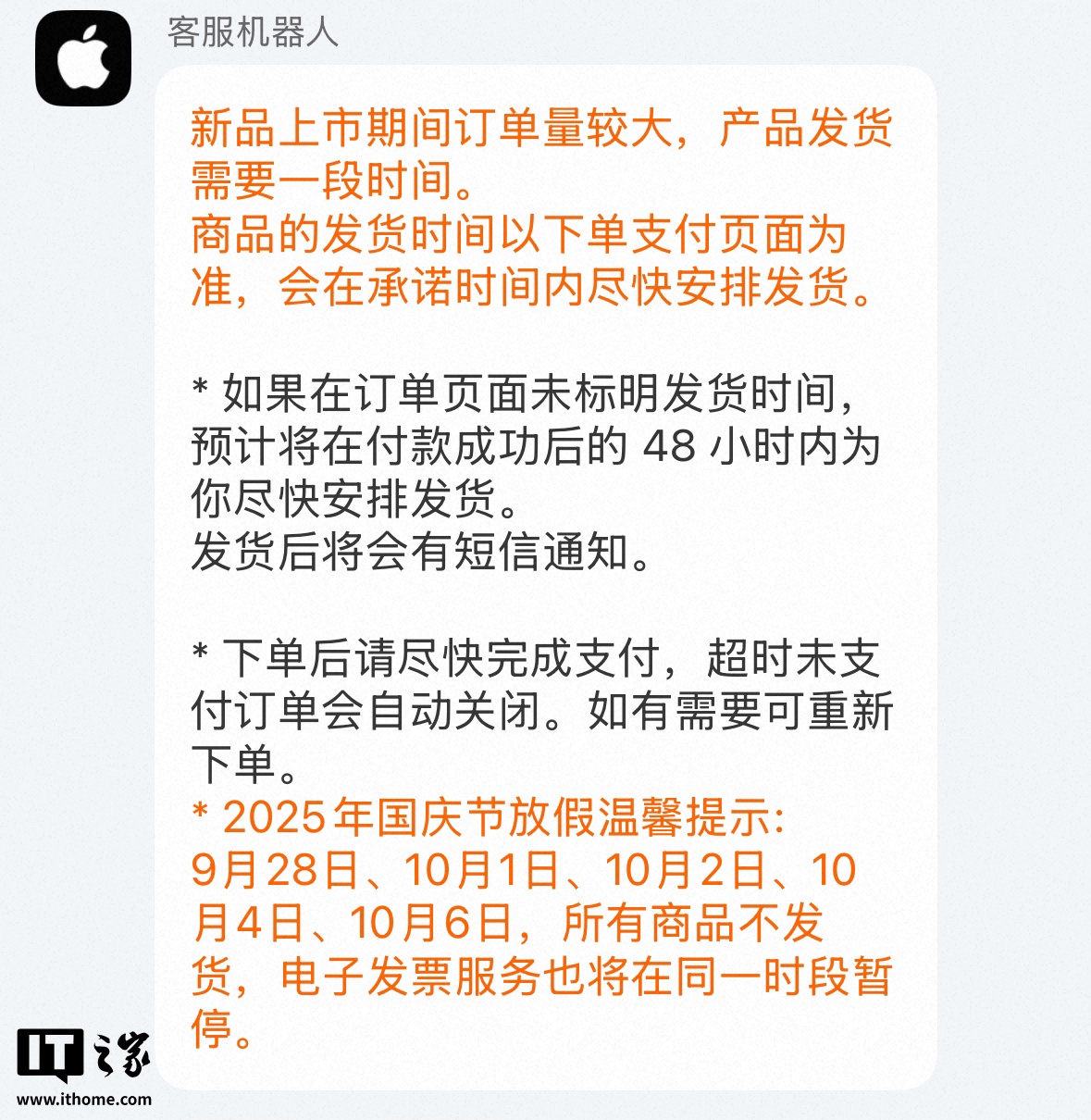 9 月 27 日消息,天猫苹果“Apple Store 官方旗舰店”昨日发布 2025 年国庆节放假温馨提示,提醒近期计划购买 iPhone 17 系列手机的消费者注意物流安排。