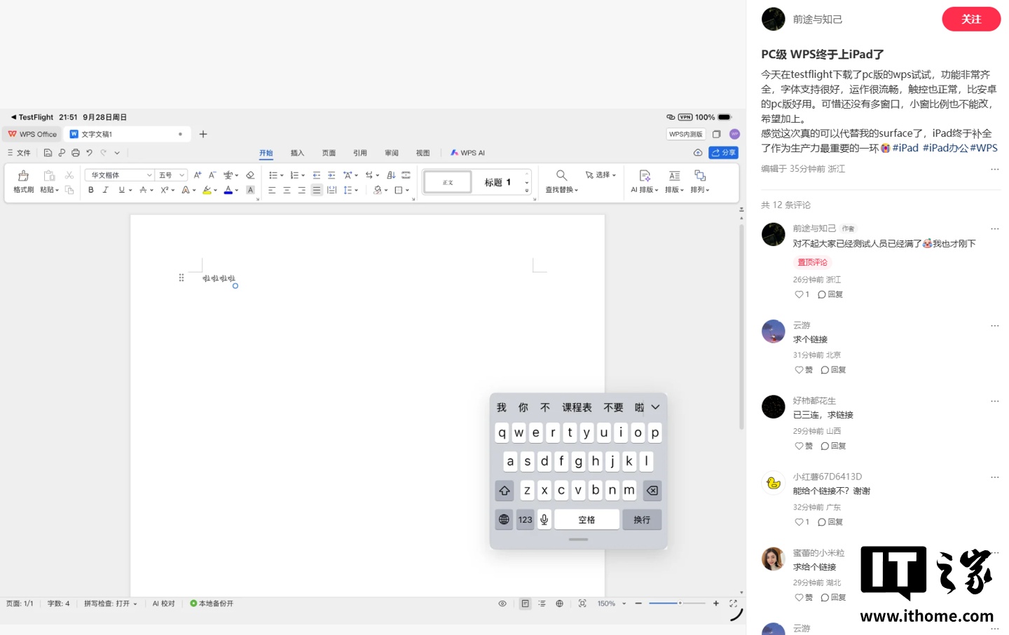 9 月 28 日消息,今日有网友发现 WPS PC 版已推出苹果 iPad 版本测试,版本号 12.9.0 Build 22444,用户可以通过 TestFlight 体验(名额已满)。