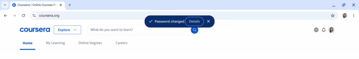 谷歌表示,Chrome 浏览器的密码管理器未来不仅会提醒用户注意不安全且强度较弱的密码,还会直接帮助用户自动更改这些密码,当浏览器在兼容网站检测到不安全的密码时,会自动弹出“帮我更改密码”按钮,点击后浏览器会在后台执行以下流程:
