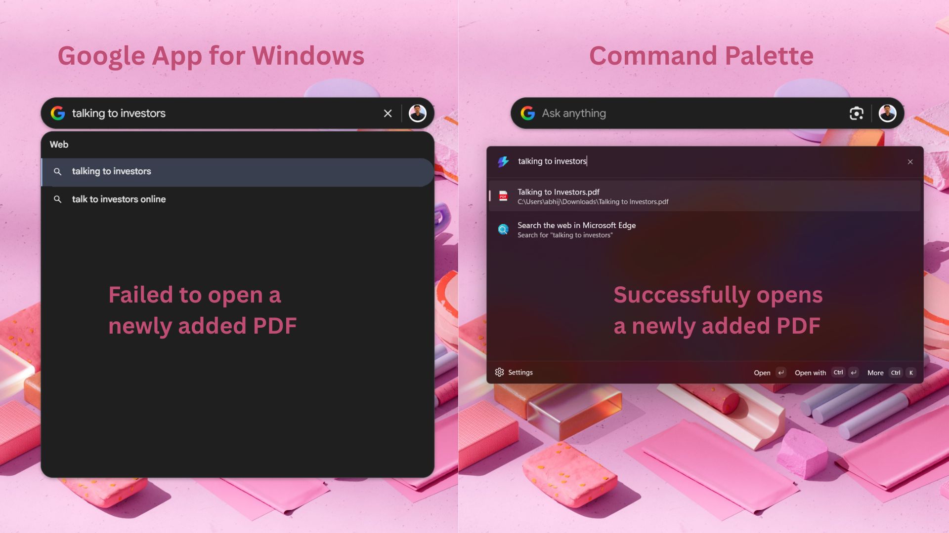 该媒体测试后,认为该应用在本地文件搜索方面尚不完善。测试发现,新下载或创建的本地文件无法被立即索引到,需要重启电脑后才能搜出,这一点逊于 Windows 原生的搜索功能。相比之下,对谷歌云盘文件的索引则是实时同步的。