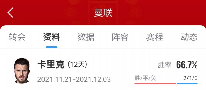 曼联2021年解雇主帅索尔斯克亚后,卡里克曾短暂担任曼联的临时主帅。他带队的3场比赛保持不败,包括在欧冠中战胜黄潜,以及联赛中战胜阿森纳。