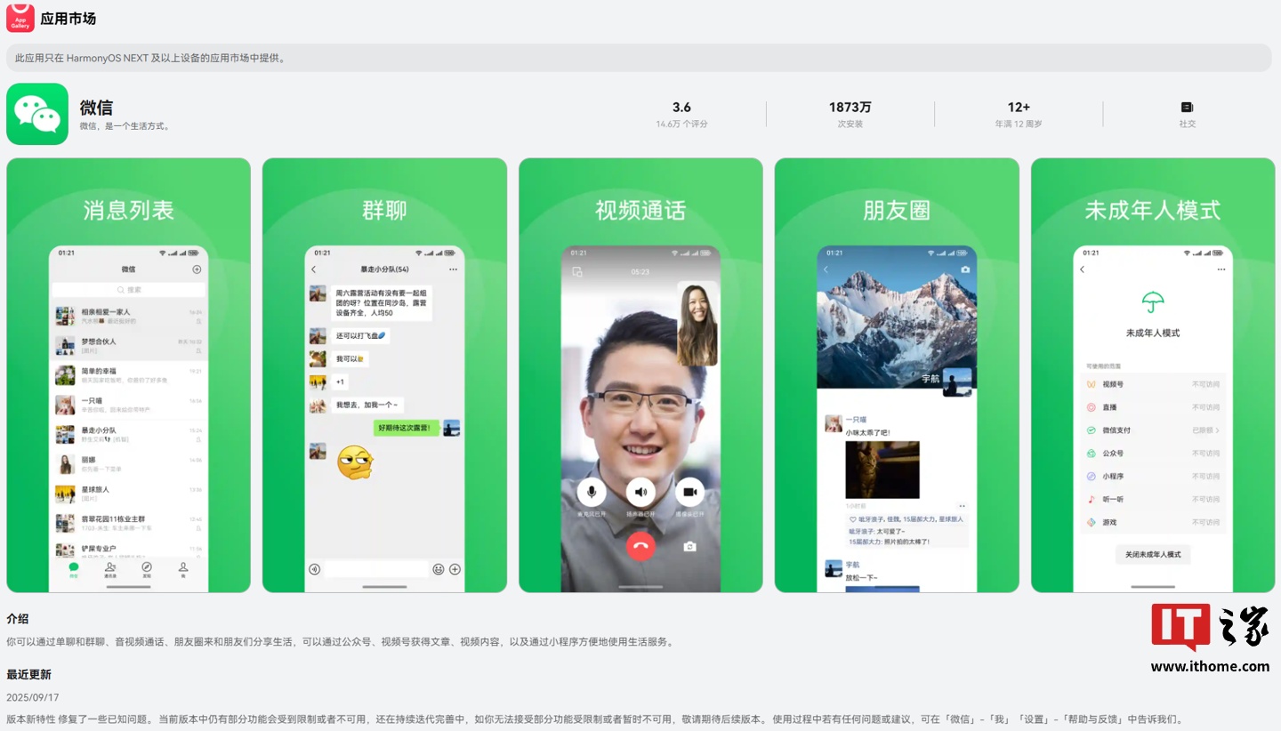据介绍,微信鸿蒙版 App 于今年 6 月 26 日正式登陆电脑端华为应用市场 App Gallery,目前主要功能包括:单聊和群聊、双人音视频通话、浏览及发表朋友圈、收藏及笔记、浏览公众号文章、浏览视频号内容、搜一搜、小程序等。