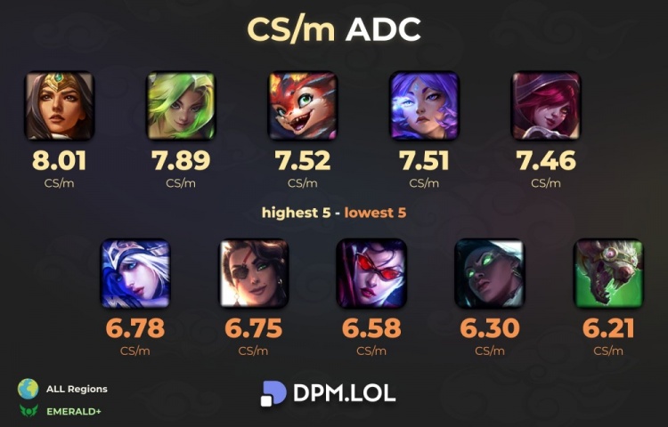 10月1日讯 根据国外数据网站DPM.LOL统计,当前版本每分钟补刀数最高及最低的ADC: