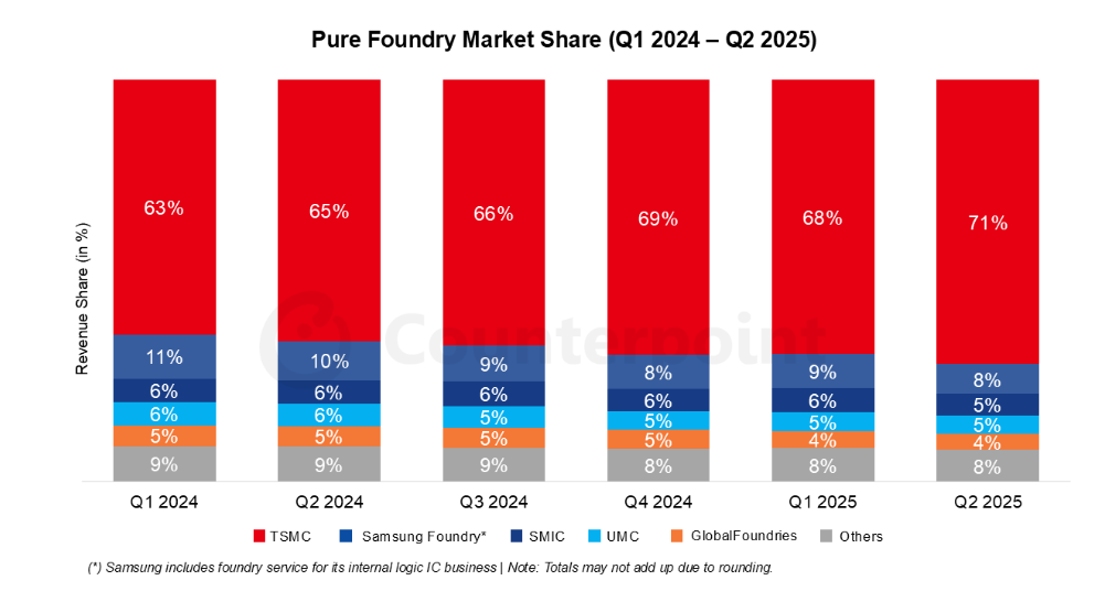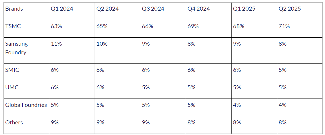 台积电在 2025 年第二季度占据了全球纯晶圆代工市场的 71%,这主要得益于 3 纳米产能的扩大、AI GPU 在 4/5 纳米制程的高利用率以及 CoWoS 技术的扩展。