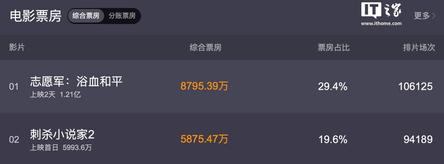 10 月 1 日消息,国产特效大片《刺杀小说家 2》于今天正式上映,参考猫眼专业版,目前该电影综合票房已达 5875 万。